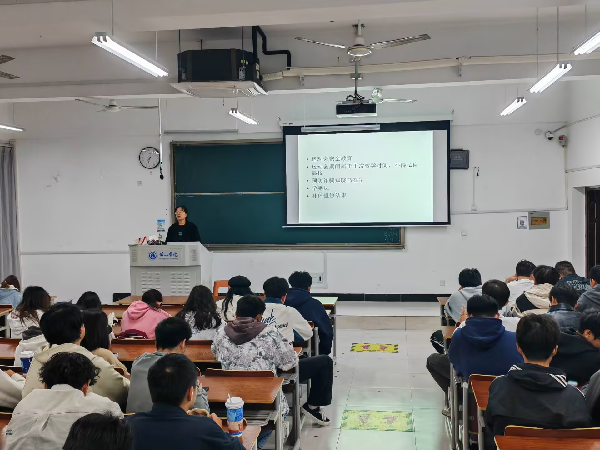 会上,为迎接即将到来的校运动会,增强同学们的安全意识和集体观念,确保运动会期间各项工作安全、有序进行,辅导员重点强调了运动会安全的重要性,详细讲解了赛前充分热身的重要性以及比赛中根据自身身体状况量力而行的必要性,并严明纪律:运动会期间属于正常教学时间,学生不得私自离校。同时针对同秋季寝室用电安全、寝室卫生、饮食安全、课堂出勤和考勤等进行强调。还针对重修补修,以及学业警示进行了一一的解读和说明。又针对劝退、试读、降级等做了详细的解释。针对学生网络公选课再次进行提醒和说明。针奖贷助补也进行了解释和解答。同时还提醒大家及时做好本学期体质测试相关工作。